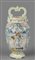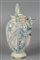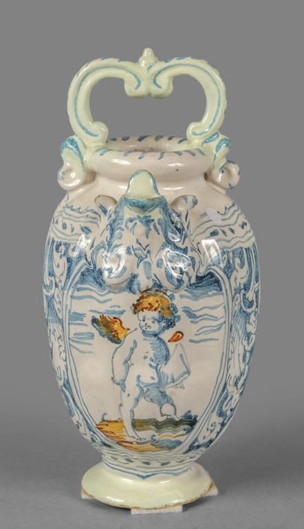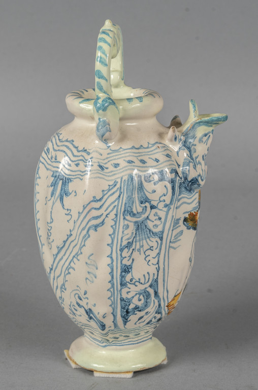 Brocca versatoio in maiolica decorata in blu su fondo bianco con al centro figura di putto alato in policromia, Faenza sec.XVIII