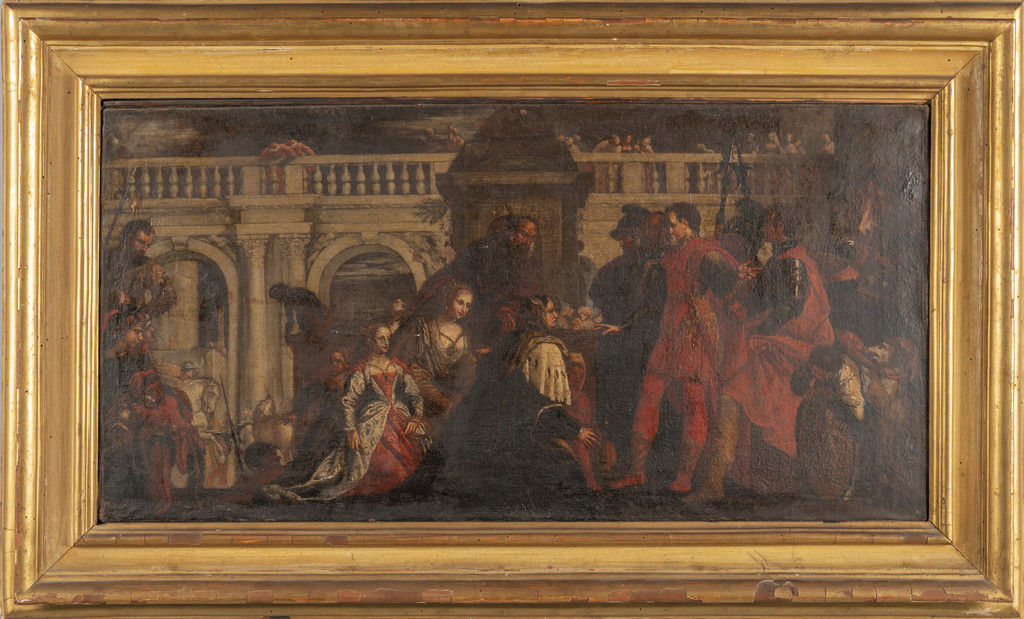 Scuola veneta sec.XVII "La visita di Alessandro Magno nella tenda dei prigionieri" olio, cornice non coeva in legno intagliato e dorato