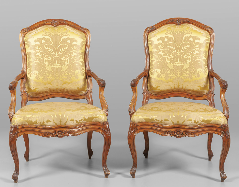 Coppia di poltrone Luigi XV in noce finemente intagliato con il motivo della pellaccia riportato sullo schienale, sui braccioli e sulla seduta, bella tappezzeria in damasco giallo, Genova metà sec.XVIII