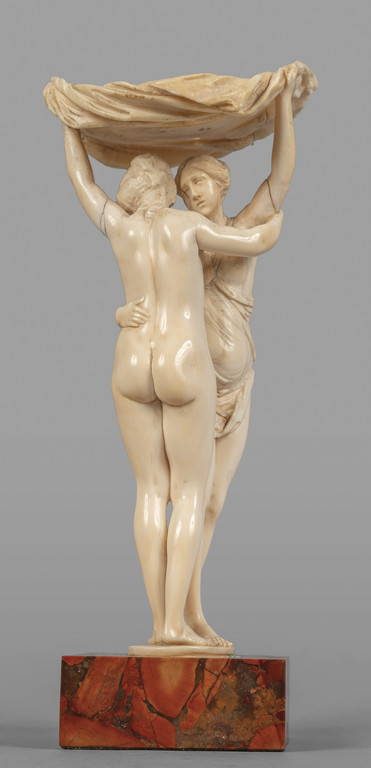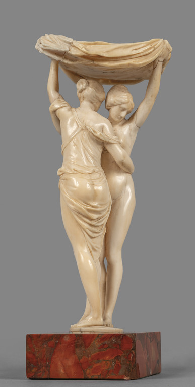 Due dame che sorreggono un vassoio, grande gruppo in avorio finemente scolpito a tuttotondo, sec.XIX