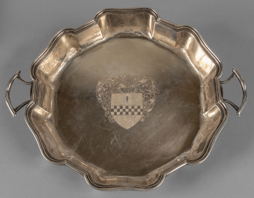 Raro vassoio Luigi XIV da portata con manici e bordo rialzato in argento finemente sbalzato e bulinato, al centro stamma nobiliare, punzone delle Torretta 172?, Genova sec.XVIII