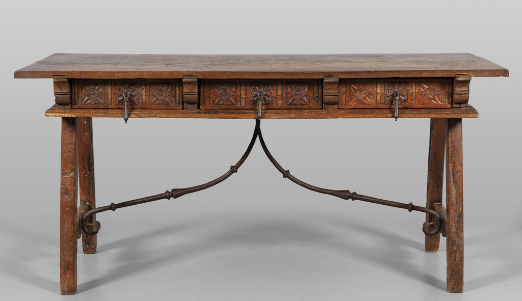 Tavolo a fratina in noce, tre cassetti nella fascia, ferri d'epoca, sec.XVII