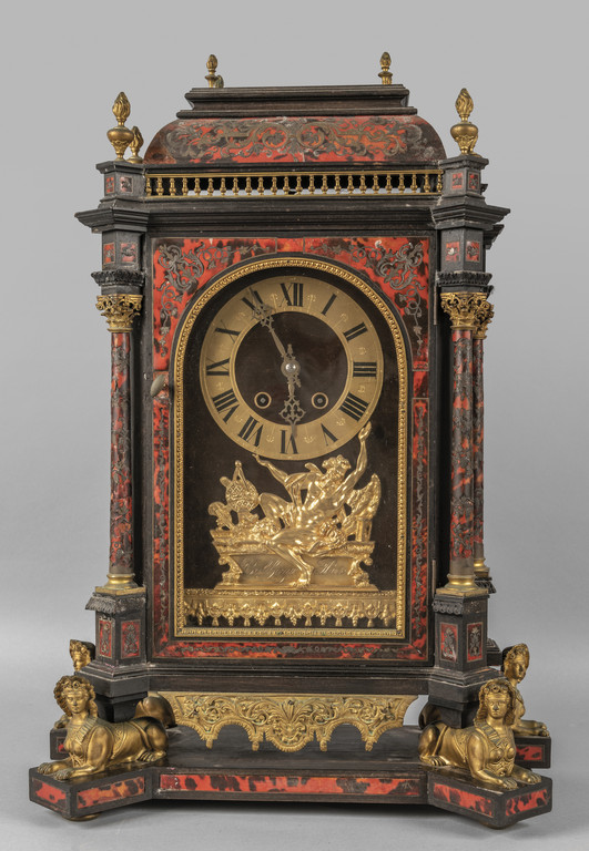 Importante orologio in stile Luigi XIV intarsiato in tartaruga e ottone, montanti a colonna con capitelli e base in bronzo dorato, il corpo sostenuto da quattro sfingi in bronzo dorato, Francia sec.XIX