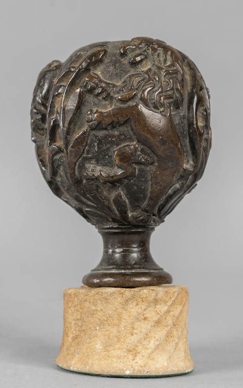 Pomolo di Faldistorio raffigurante leoni rampanti, bronzo a patina scura montato su base in pietra, Nord Europa sec.XVI