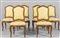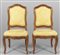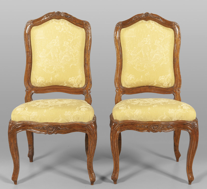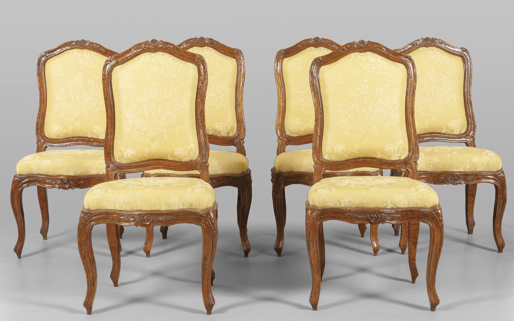 Sei sedie Luigi XV in noce finemente intagliato con il motivo della pellaccia, bella tappezzeria in damasco con cineserie, Genova sec.XVIII