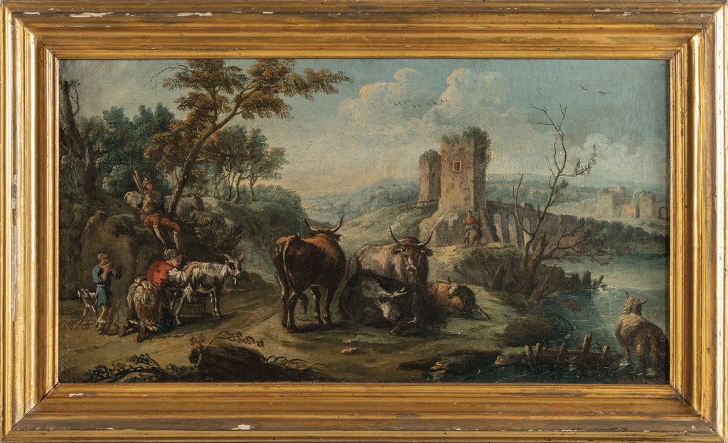 Scuola napoletana sec.XVIII "Paesaggio con figure ed armenti" olio