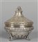 Raffinata zuccheriera in argento finemente sbalzato A.Bonani, Parma sec.XVIII, nella sua scatola originale in cuoio