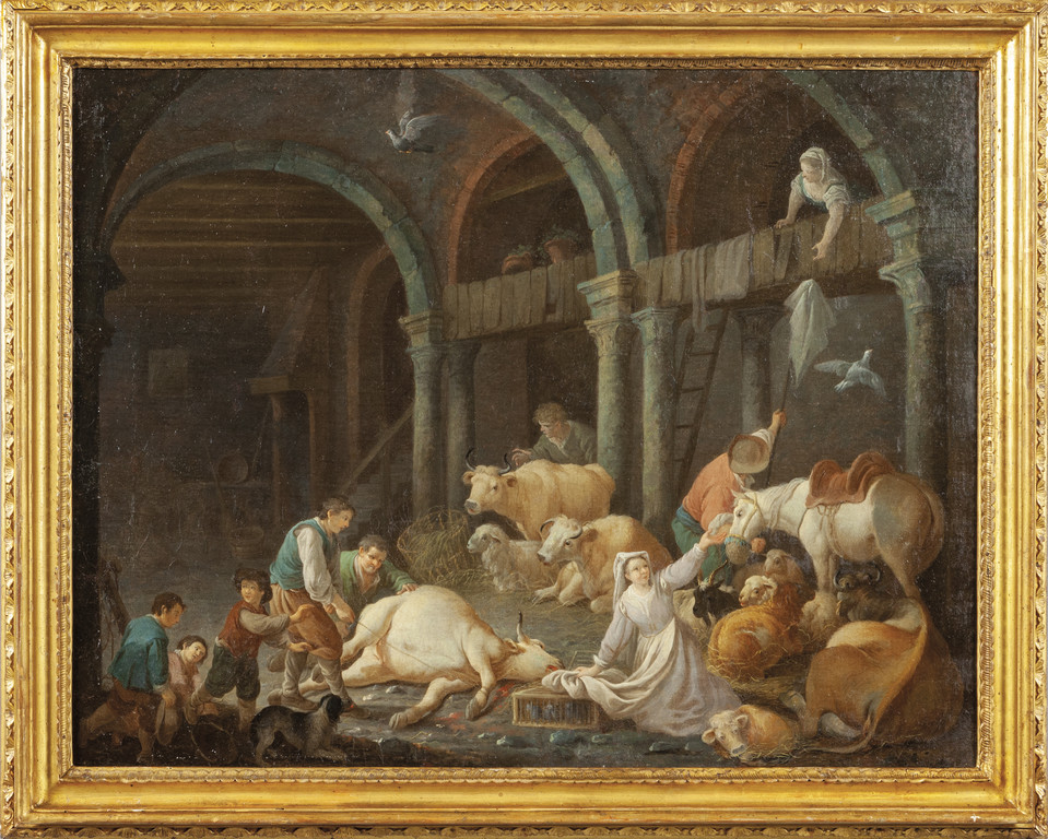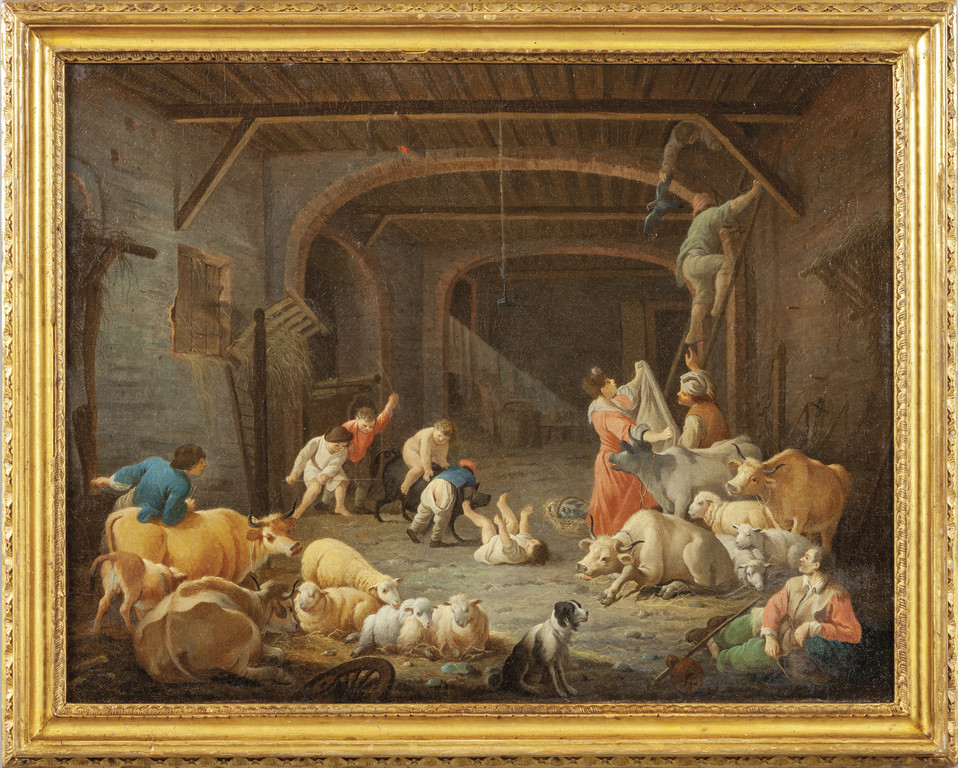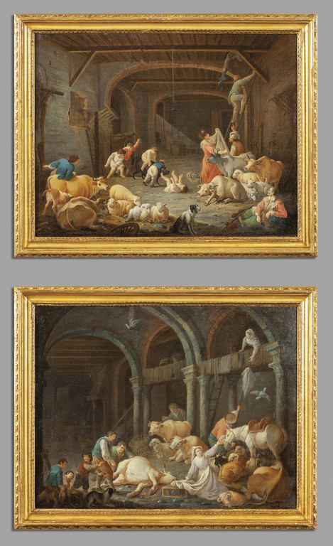 "Interni di stalla animati con figure e animali" coppia di olii, cornice coeva in legno intagliato e dorato