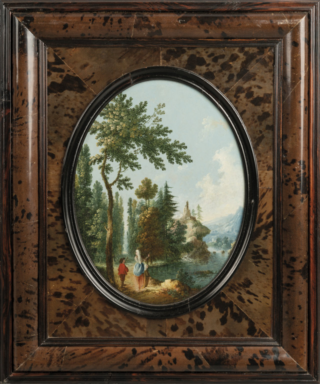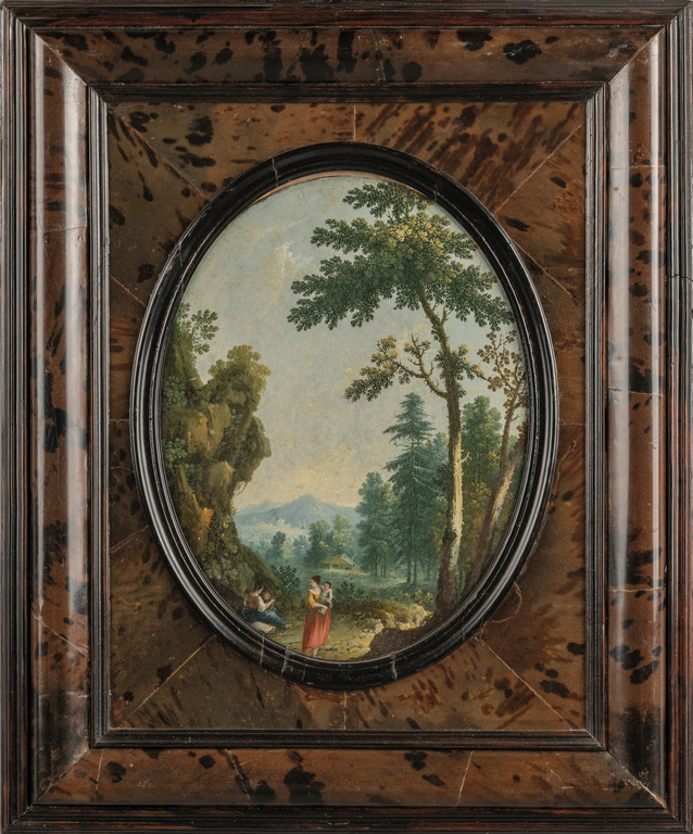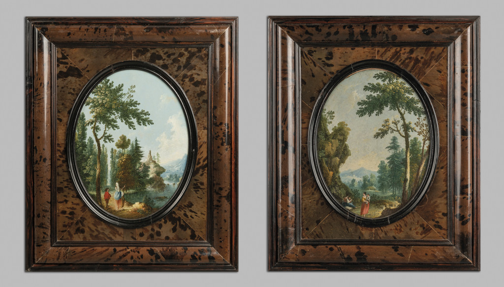 "Paesaggi con figure" coppia di dipinti su rame, cornici coeve lastronate in tartaruga, sec.XVIII