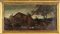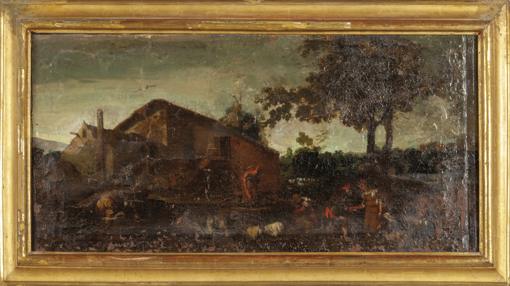 "Paesaggio con figure" olio sec.XVII, antica cornice coeva a sagoma romana in legno intagliato e dorato