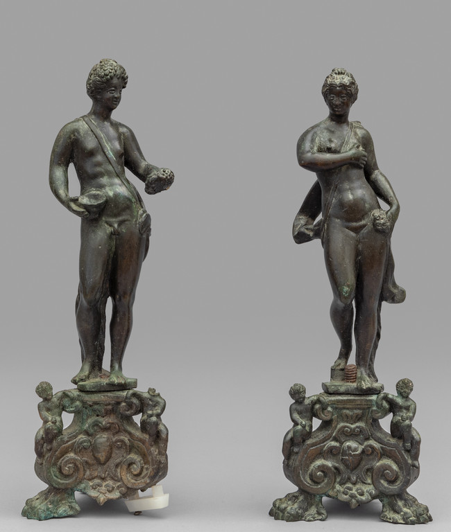 Bacco e Venere, coppia di sculture in bronzo a patina scura poggianti su basi sorrette da tre putti, sec.XVII