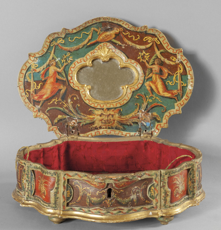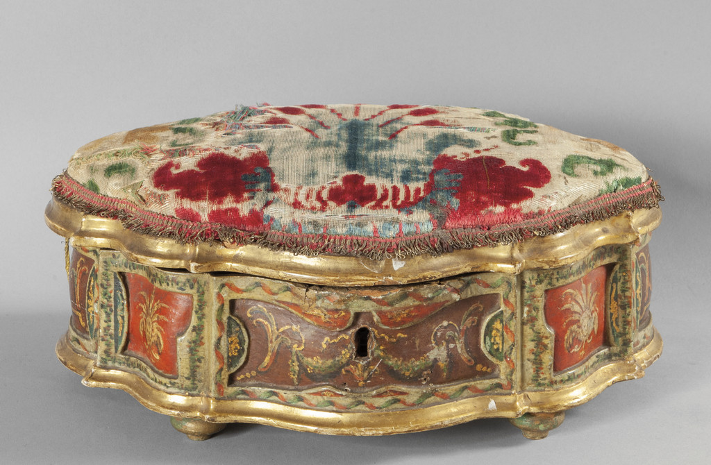 Scatola da cucito Luigi XIV di forma movimentata in legno decorato in policromia a tutto tondo, Italia Centrale sec.XVIII