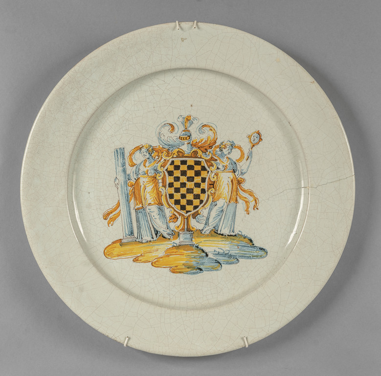 Grande piatto in ceramica bianca con al centro stemma nobiliare in policromia, Faenza sec.XVII