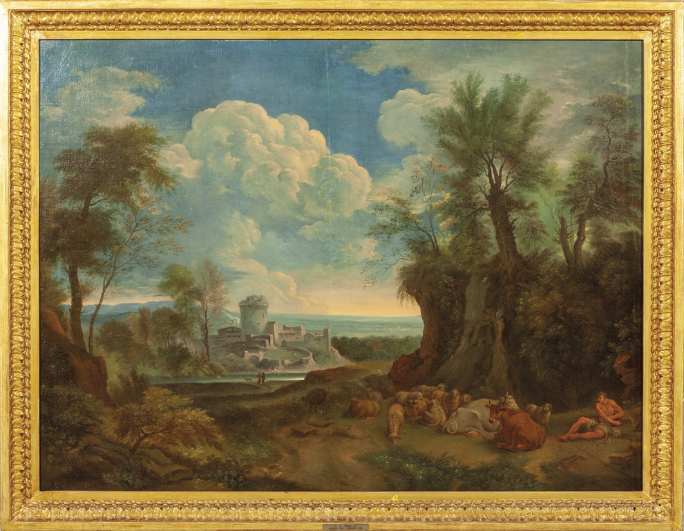 Scuola genovese sec.XVIII (Carlo.Antonio.Tavella) "Paesaggio con castello animato da figure e animali" olio
