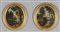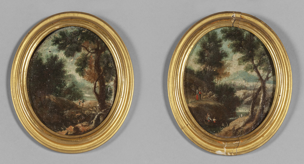Scuola veneta sec.XVIII "Paesaggi con figure" coppia di olii su tavola di forma ovale, cornici coeve in legno intagliato e dorato
