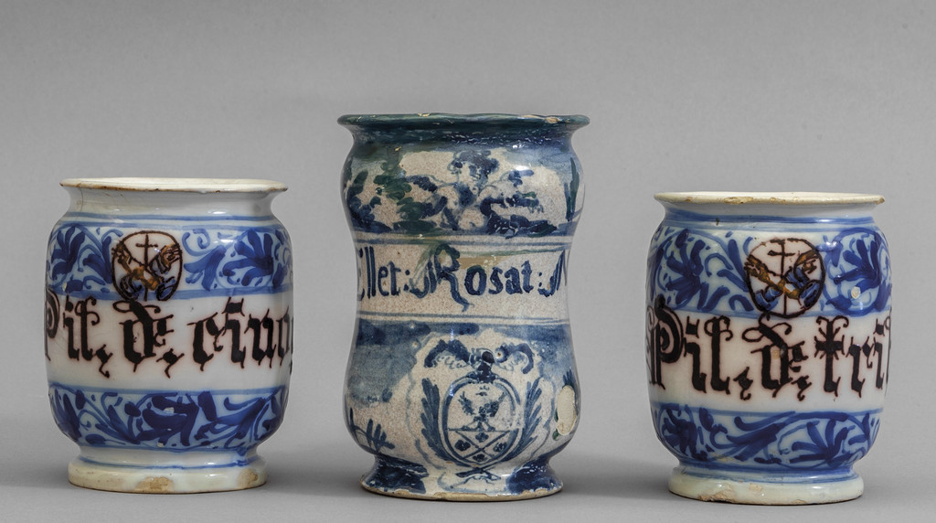 Coppia di albarelli, Faenza sec.XVIII (h.cm.9,5) e piccolo albarello in ceramica di Savona blu su fondo bianco, marca Siccardi (h.cm.12, difetti)