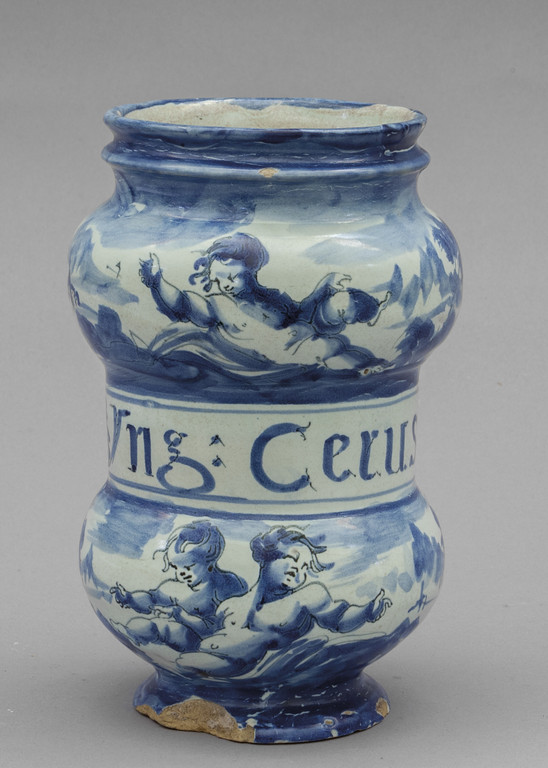 Albarello in ceramica di Savona con putto, marca Lanterna sec.XVIII