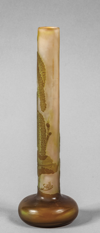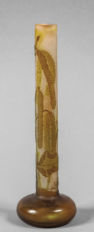Bottiglietta in vetro lavorato all'acido con nocciole, f.ta Gallè