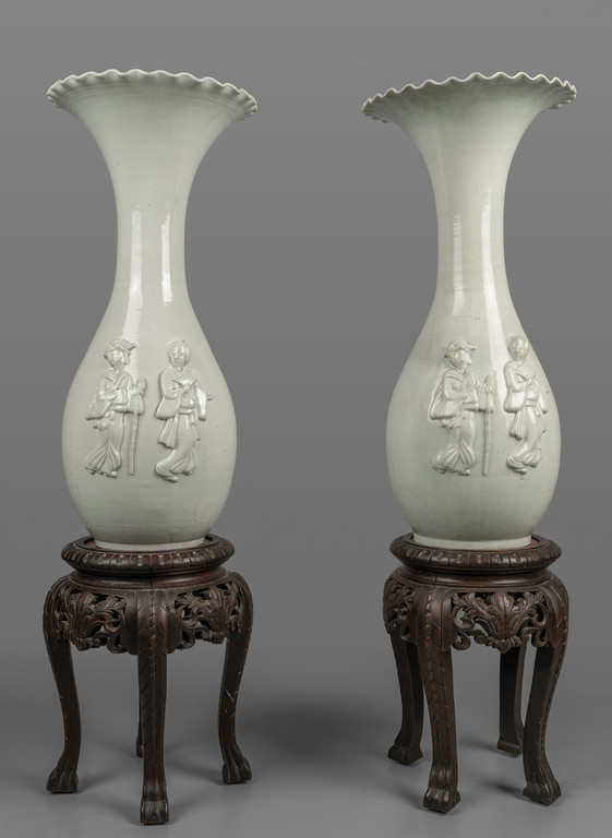 Coppia di vasi Celadon, Giappone sec.XIX (h.cm.69) con due panchetti portavaso (h.cm.40)