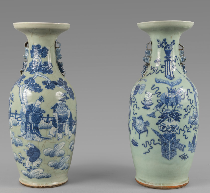 Coppia di vasi in porcellana decorati in blu su fondo celadon, Cina sec.XIX