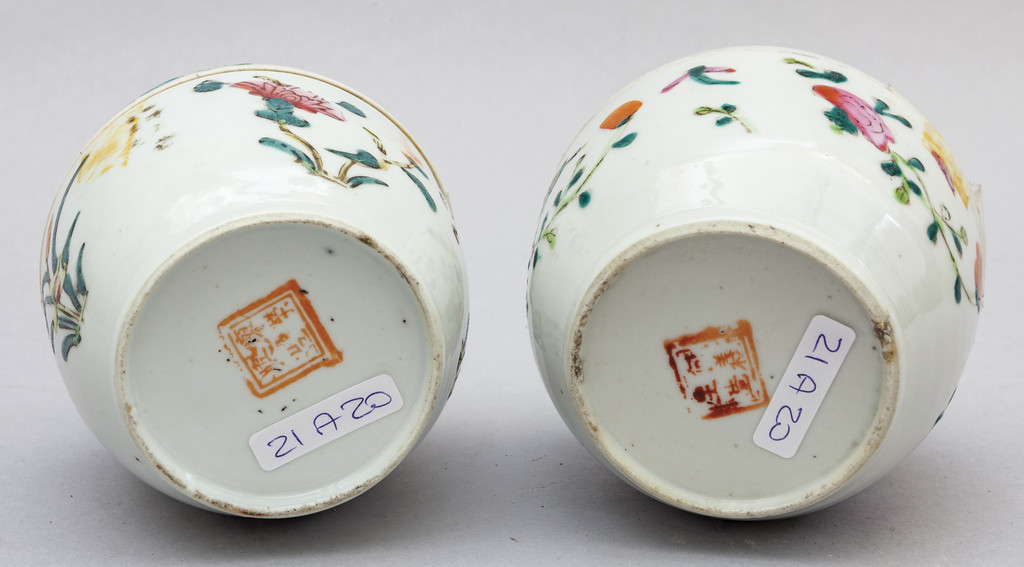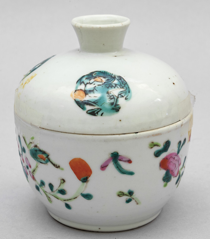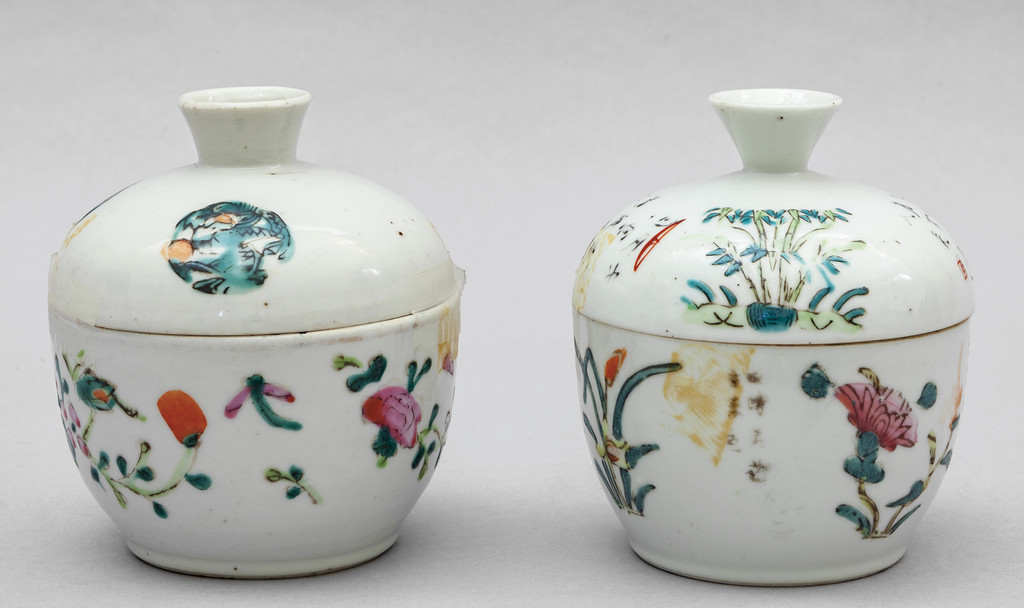Coppia di ciotole con coperchio in porcellana decorata in policromia a fiori, Cina sec.XIX