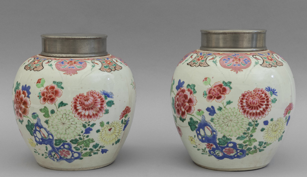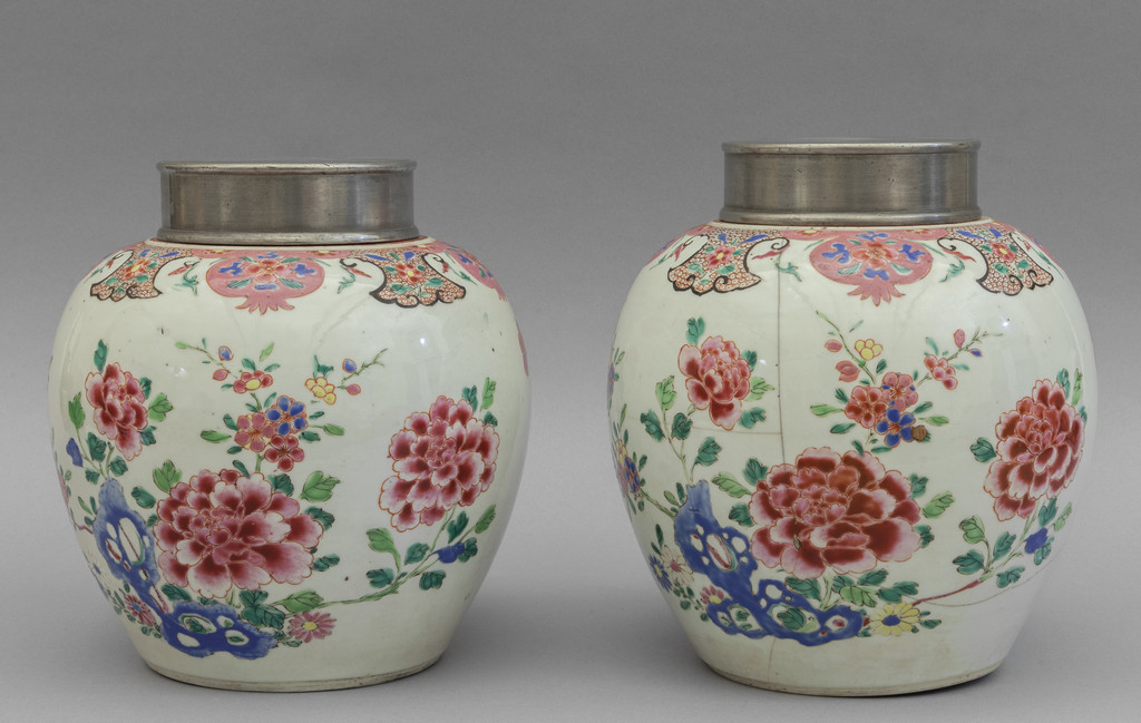 Coppia di vasi in porcellana, famiglia Rosa, decoro floreale, Cina sec.XVIII