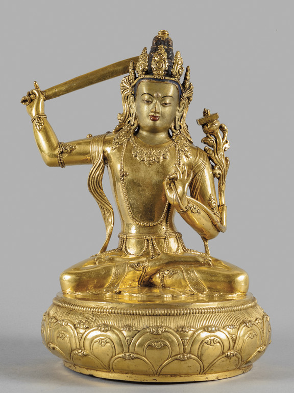 Bodhisattva Manjusri ornato di gioielli seduto in Padmasana sopra ad un fiore di loto, la mano destra brandisce una spada mentre la sinistra un fior di loto che sorregge il sutra della perfezione della saggezza o della conoscienza trascendentale, tracce di pittura sul viso e sui capelli