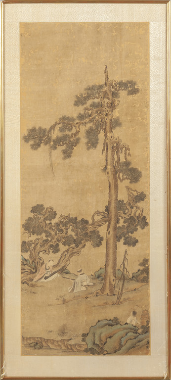 Antico pannello su tela raffigurante suonatori sotto a un pino, Cina sec.XIX