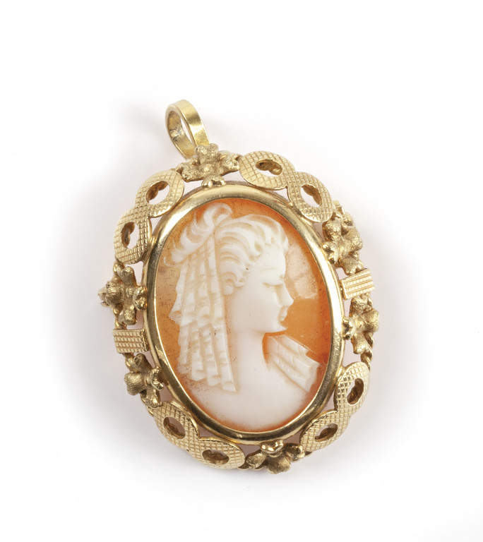 Spilla/ciondolo in oro giallo portante cammeo inciso a profilo femminile