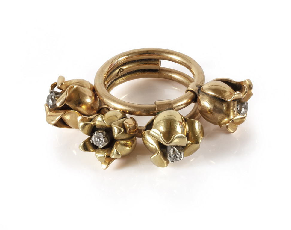 Particolare anello in oro giallo e rosa epoca anni '40 portante quattro fiori tremblant con pistilli in diamanti