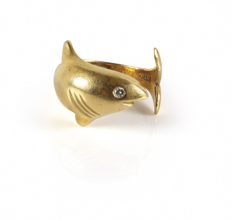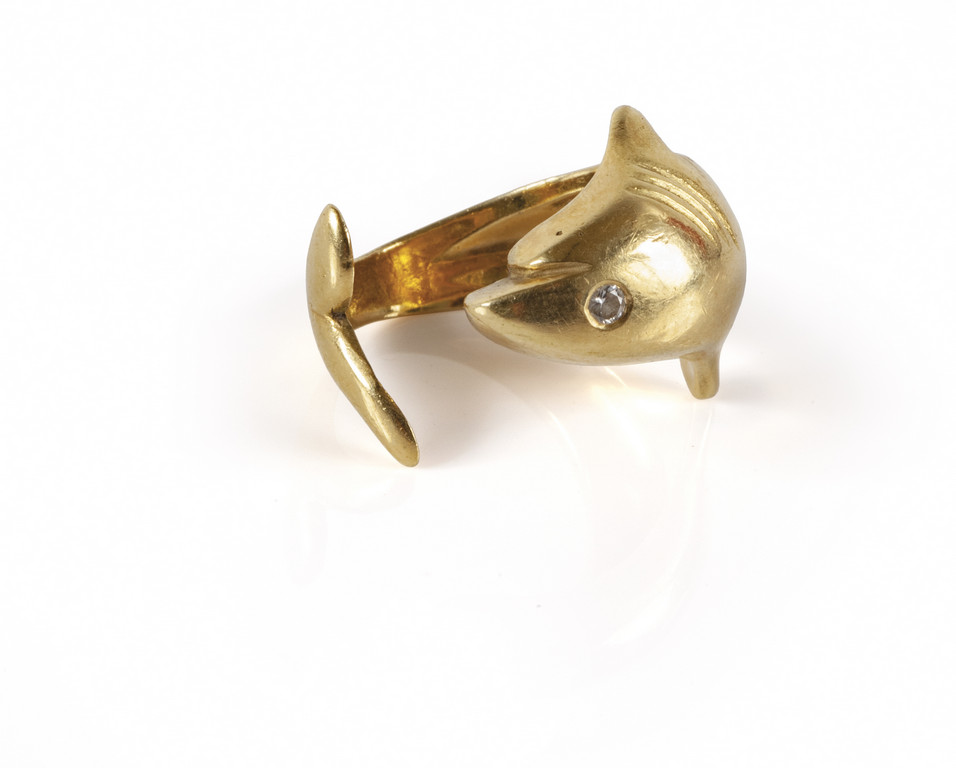 Anello in oro giallo a forma di squalo, occhio con piccolo brillante