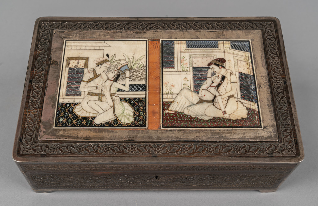 Scatola in argento finemente sbalzato, sul coperchio due miniature in avorio a soggetto erotico, India sec.XVIII