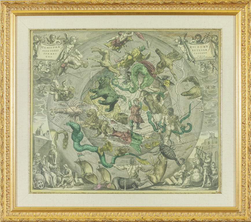 "Emisfero celeste" incisione acquarellata incollata su tavoletta, sec.XVIII