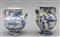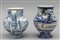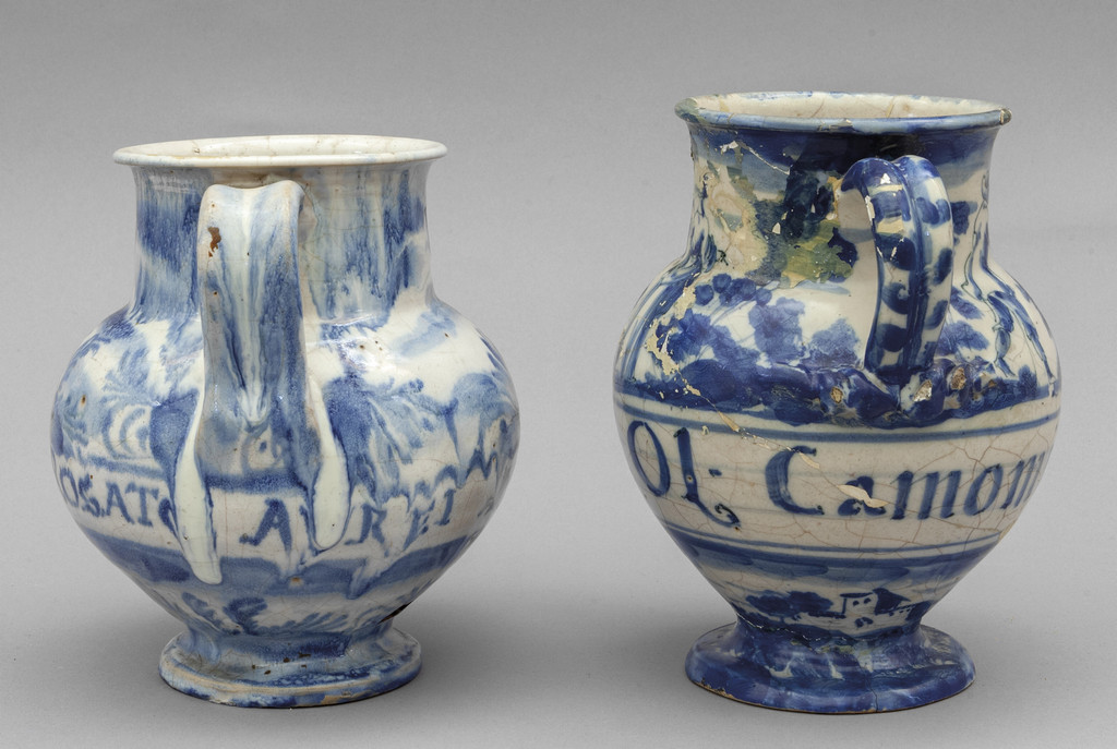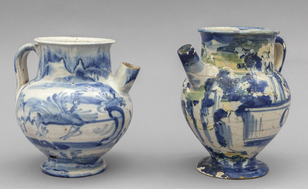 Versatoio in ceramica di Savona con figurine e scritta olio alla camomilla, alla maniera del Berti, Savona sec.XVIII (h.cm.20, gravi difetti) e verstoio in ceramica di Savona, decorazione blu su fondo bianco, sec.XVIII (h.cm.20, difetti e mancanze)