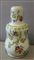 Servizio da notte formato da una bottiglia con bicchiere in porcellana decorata a fiori su fondo bianco