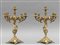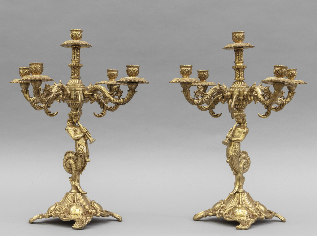 Coppia di candelabri in metallo dorato a cinque luci, fusto con sirene