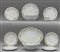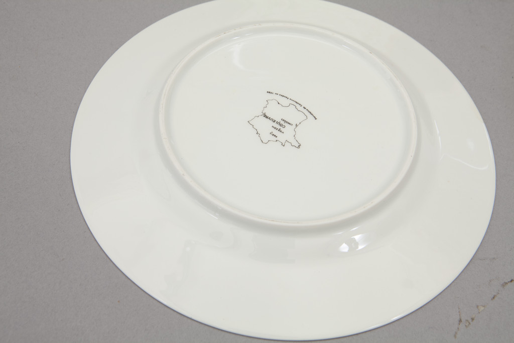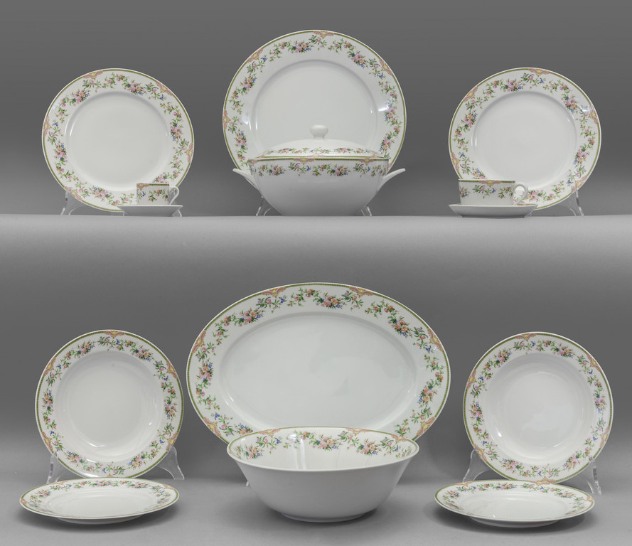 Servizio di piatti Limoges Couleuvre in porcellana bianca con fiorellini e bordo verde composto da: 11 piatti piani, 12 fondi, 12 frutta, 11 tazzine con 12 piattini da caffè, 1 zuppiera, 1 piatto da portata rotondo e 1 ovale, 6 tazze con piatino da thè e 1 insalaltiera