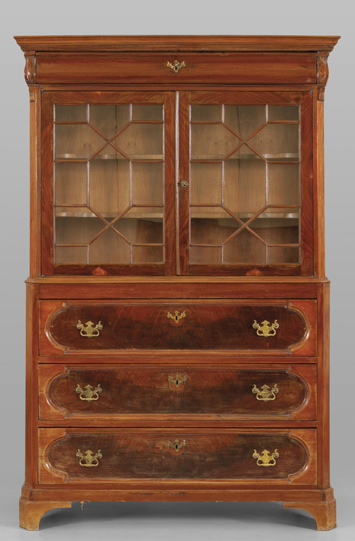 Libreria inglese a tre cassetti, parte superiore a vetrina, Inghilterra sec.XX