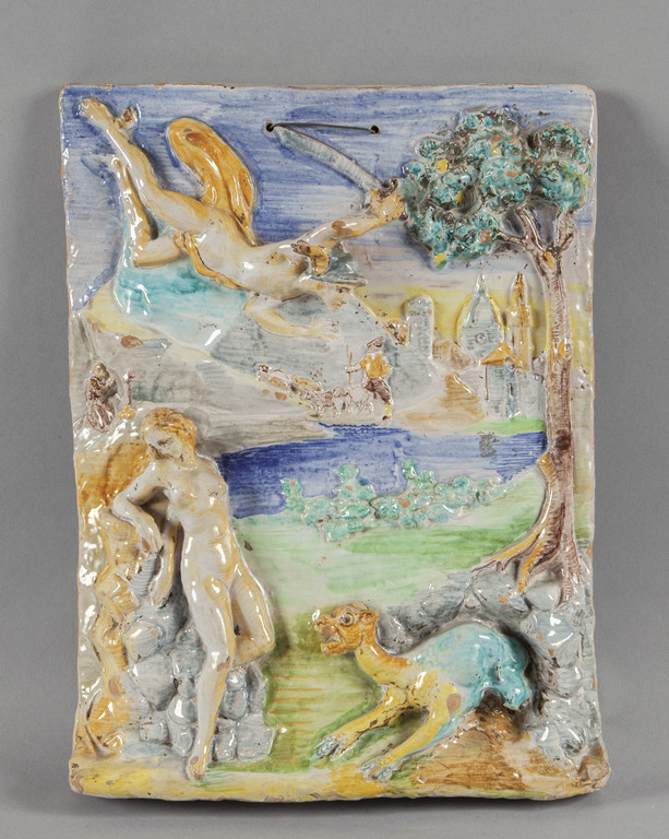 Placca in ceramica policroma raffigurante scena mitologica, Italia Meridionale sec.XIX