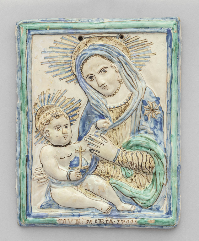Placca in maiolica policroma raffigurante la Madonna con Bambino (Ave Maria), Italia Centrale sec.XVIII