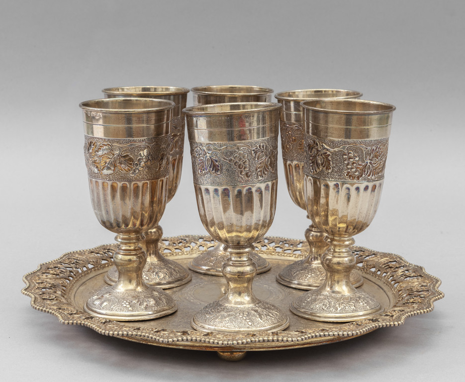 Sei bicchieri con vassoio in argento finemente sbalzato