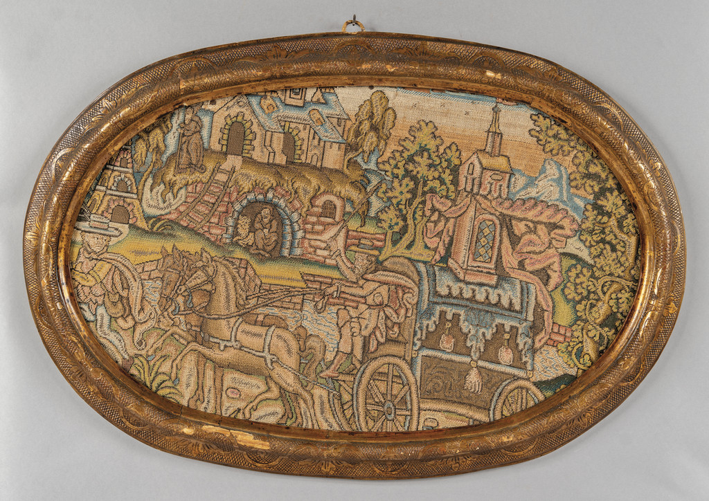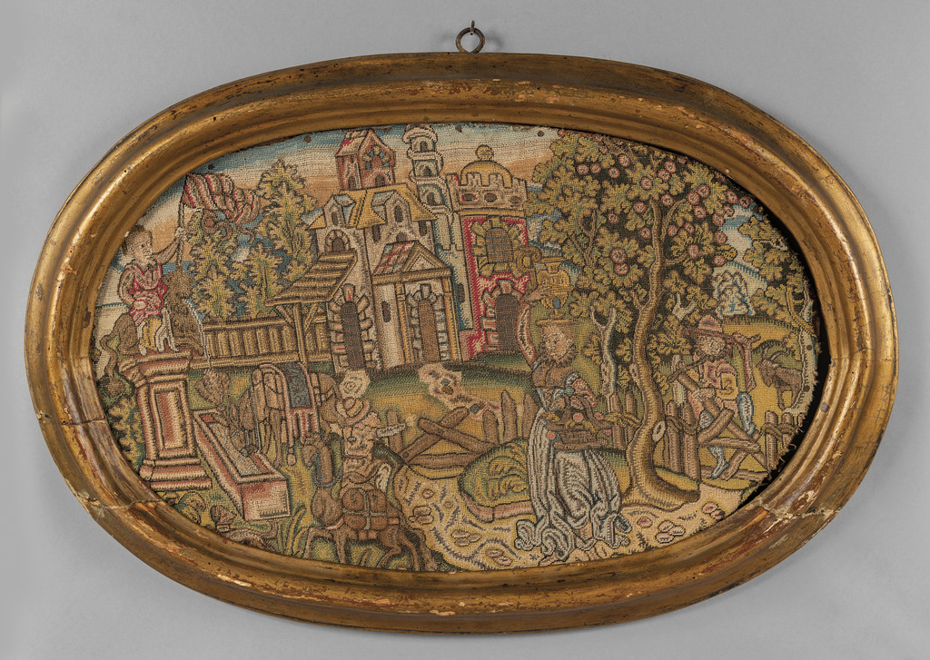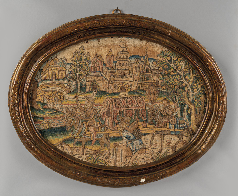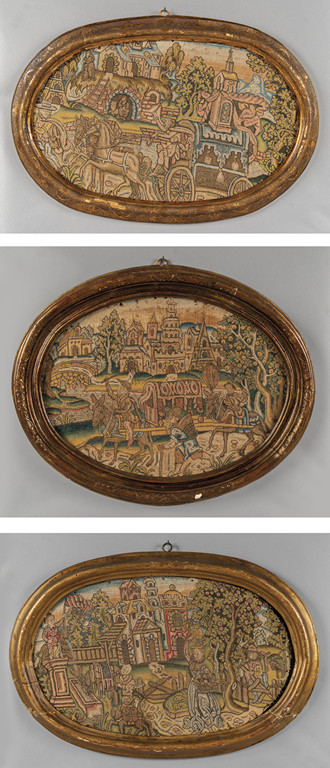 Scuola inglese sec.XVII "Paesaggi con città turrite" tre quadretti a piccolo punto