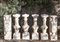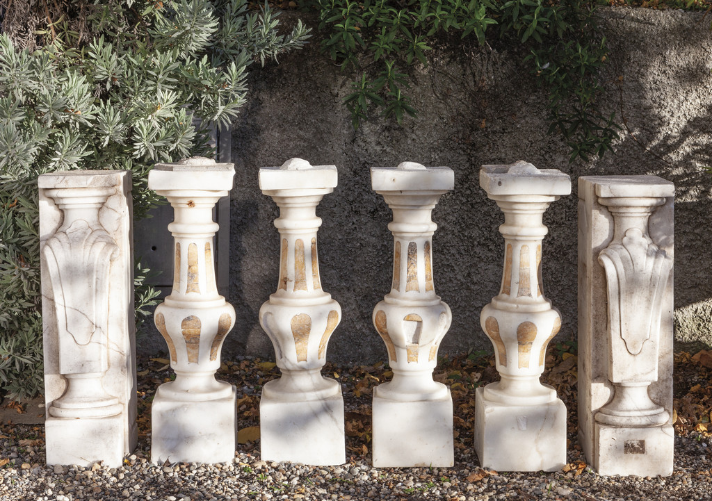 Due montanti (h.cm.59) e quattro elementi di balaustra (h.cm.54, difetti) in marmo, sec.XVII