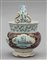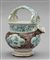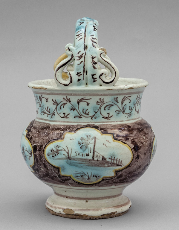Versatoio con manico in maiolica, decorazione a riserve policrome su fondo manganese, Savona sec.XVIII