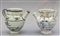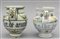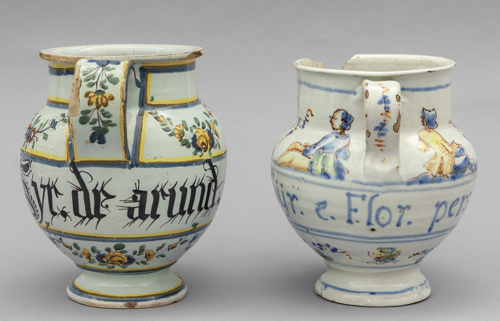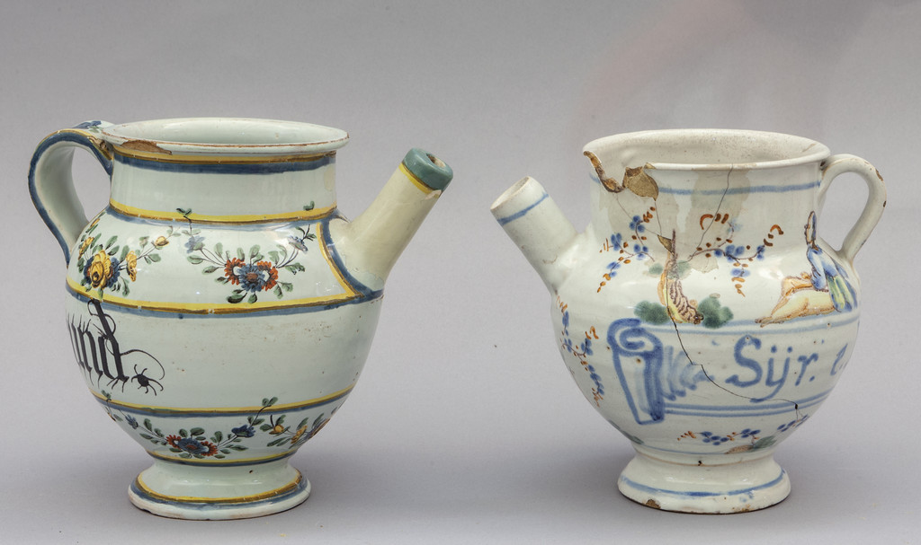 Versatoio in ceramica di Savona, decorazione in policromia su fondo bianco con scritta medicinale, marca Lanterna sec.XVIII (h.cm.18, difetti e mancanze) e versatoio in ceramica policroma decorato a fiorellini con scritta medicinale, Torino sec.XVIII (h.cm.18, difetti e mancanze)