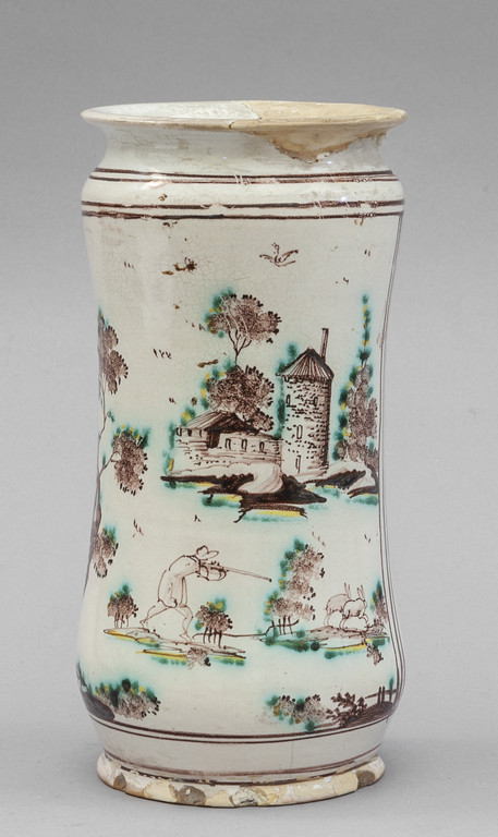 Albarello in ceramica decorato in policromia con scene di caccia, Napoli sec.XVIII