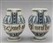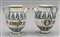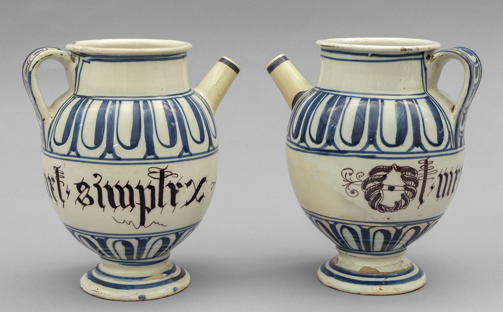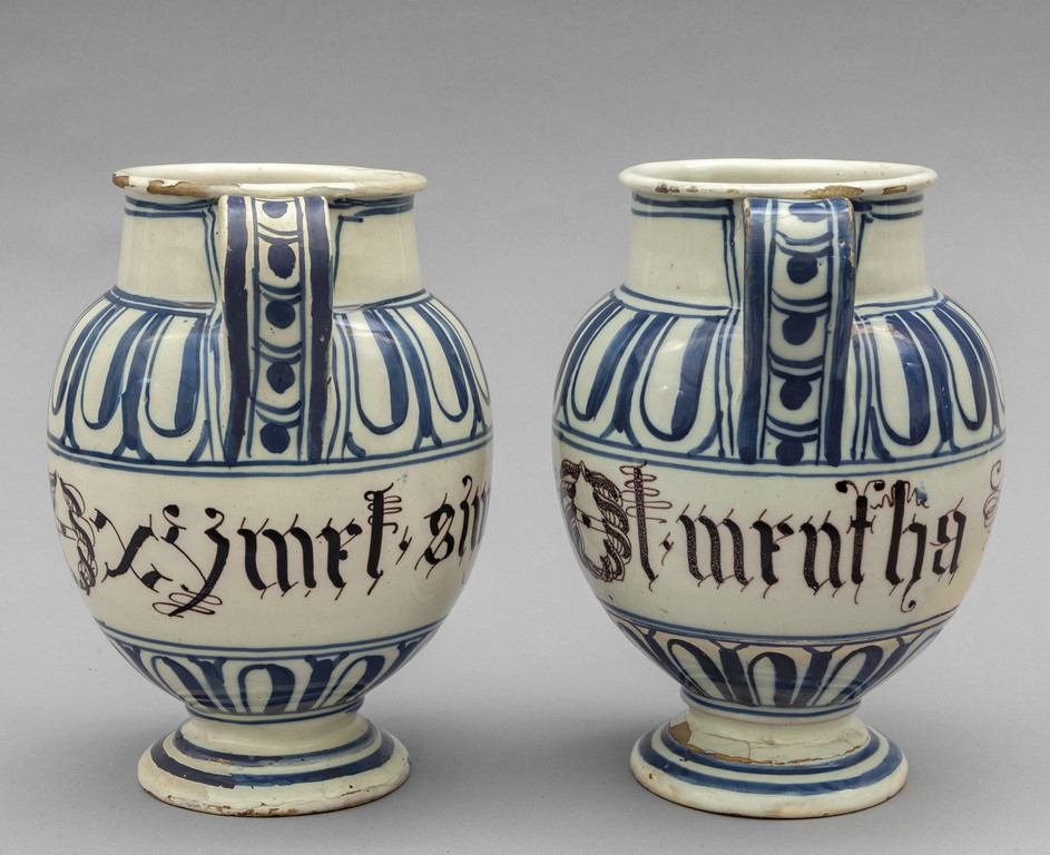 Coppia di grandi versatoi in ceramica, decorazione bianca e blu con scritta medicinale, Faenza sec.XVIII
