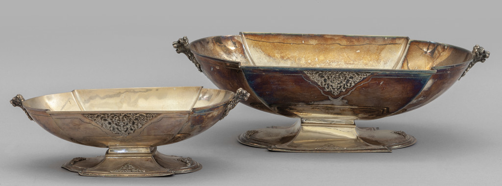 Alzata Decò centrotavola in argento, prese con teste di leone ed una più piccola analoga