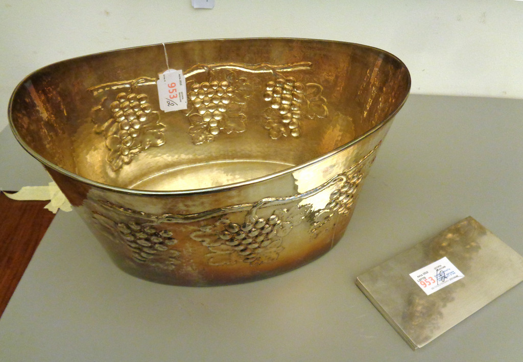 Grande secchiello in metallo argentato sbalzato con grappoli d'uva (cm.38x26xh.20) e scatola in metallo argentato