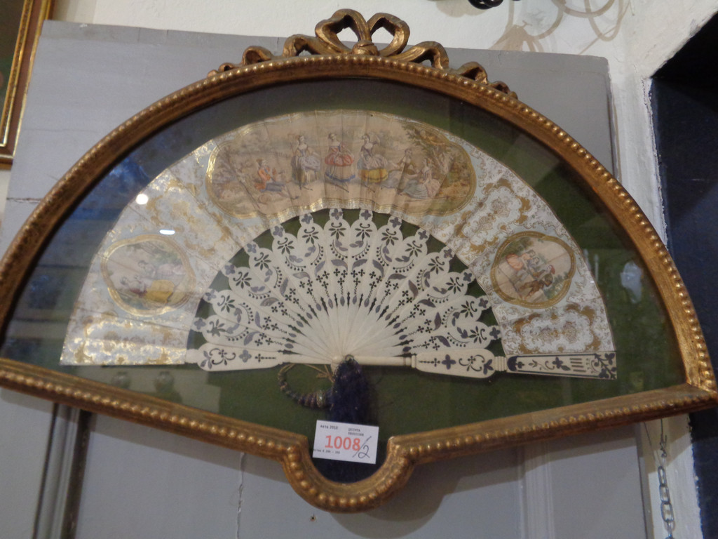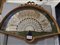 Coppia di teche in legno intagliato e dorato di forma semicircolare con all'interno due ventagli con stecche in avorio, decorati con figure miniate sec.XIX